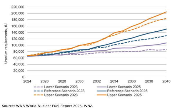 Positive momentum for nuclear power continues to grow, both due to large scale reactor build and SMRs. The three WNA scenarios for nuclear generating capacity all increased in the 2025 report vs the 2023 report looking out to 2040. The Upper scenario sees 966 GWe in 2040 including 110 GWe of Generic SMR. That is 6.3% CAGR and up 35 GWe over 2023.